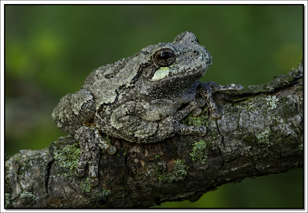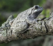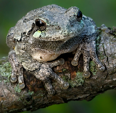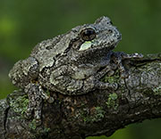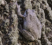 Grey Treefrogs are a medium size frog with big round toes that act like suction cups for easy scaling up trees and other verticle objects. They occasionally hang out around light sources at night to feed on the insects that are attracted to the lights. Their main foods are beetles, moths, caterpillars, flies, ants, spiders and leafhoppers.