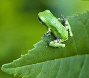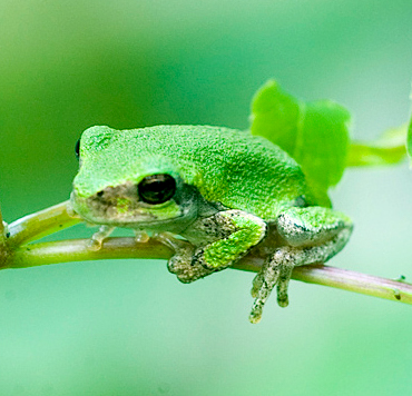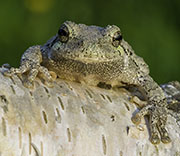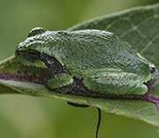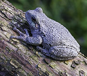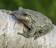 Gray treefrogs breed in late spring and early summer. The males call are loud deep flutey trills as they inflate their throats like balloons. During the day, these frogs remain in trees around the breeding pond. In the evening, males call from trees and shrubs but enter the pond after finding a mate. Even after mating, the male will hang around and keep calling in hopes to attract with late arriving females. When the mating season is over, the return to the treetops, occasionally singing later in the summer on humid or warm rainy evenings.