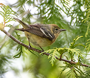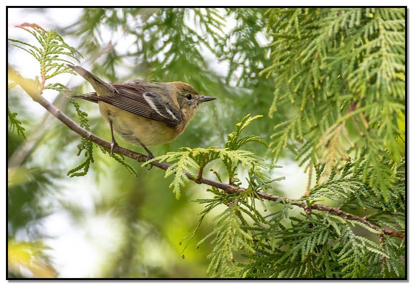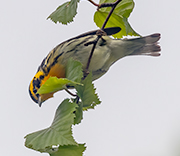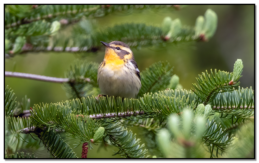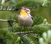 - HABITAT -Blackburnian Warbler nests in mature coniferous and mixed forest and often occurs in highest densities in old-growth forests. At the end of the breeding season, they often leave the conifers to forage in virtually any woody habitat. Their range is southeastern boreal forest in Canada and in the Appalachians and Great Lakes region. Their wintering grounds in the highlands of southern Central and northwestern South America.
